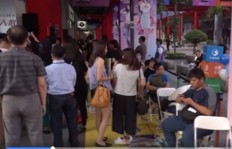 除了现场排队买手机的人们,还有一种让人羡慕嫉妒恨的人他们就是提前在网上预购的人们,他们今天早上在另一条通道排队区手机。
