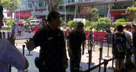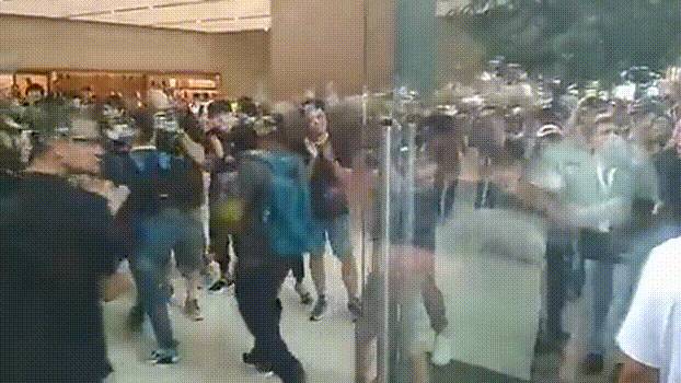 苹果的工作人员和现场的保安人员急忙维持秩序,让排队的粉丝回到原位。