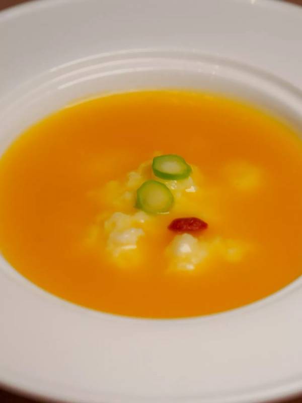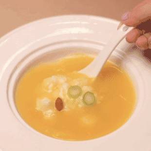 鸡豆花这道传统川菜中,一上桌就给人赏心悦目的感觉。金黄色的高汤中隐藏着洁白的鸡豆花。面上搭配上一点绿色与红色的点缀,将鸡豆花舀出来更是黄白相间,黄、白、绿、红相互呼应。