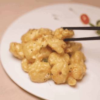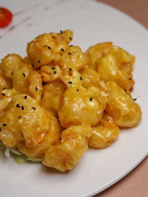 卡夫富贵虾给人一种粤菜的感觉,新鲜的虾球过油之后再裹上特调的卡夫酱,入口有奶香味,微微带甜,尤其是小孩子会特别的喜欢。