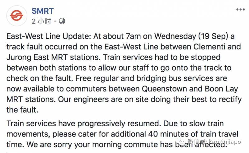 SMRT今天早上7点紧急发布脸书,安排了免费的班车鼓励大家搭乘。并且称“工作人员正在加急处理……文礼站和女皇镇站之间的列车服务将延误40分钟”。