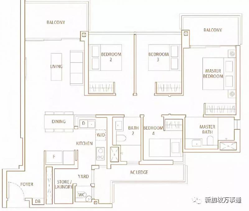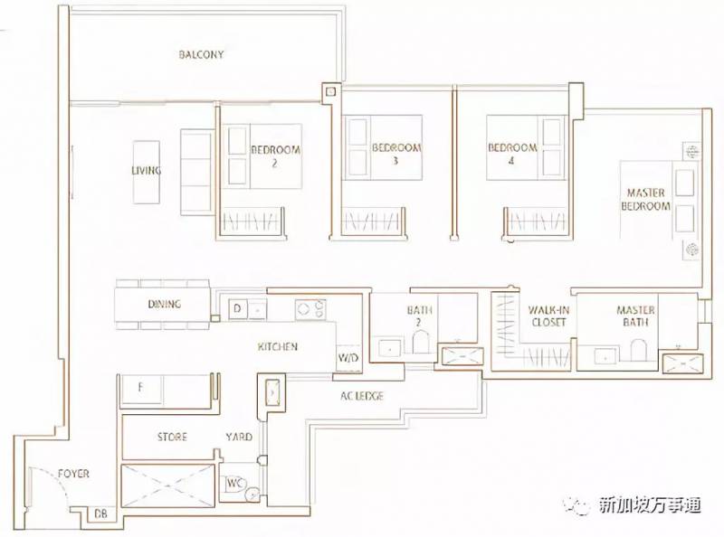 标准四卧户型,包括工人房和yard,面积117平米(1259平方尺),186万新币起售。