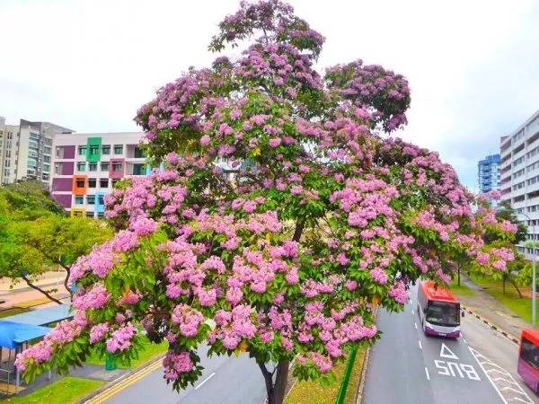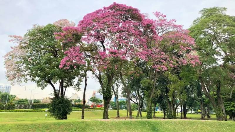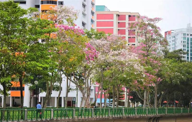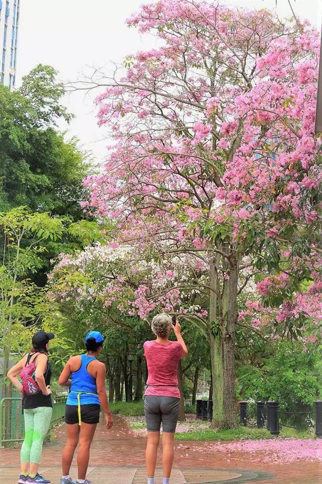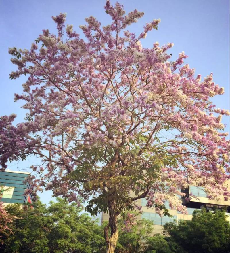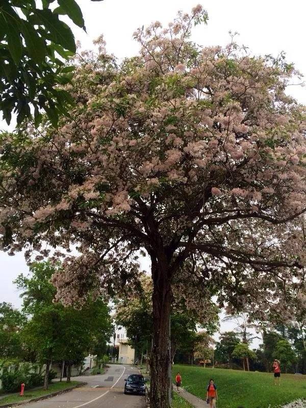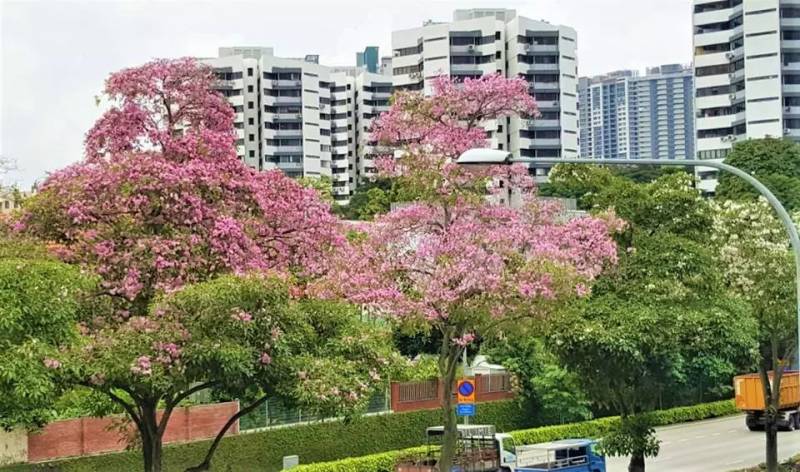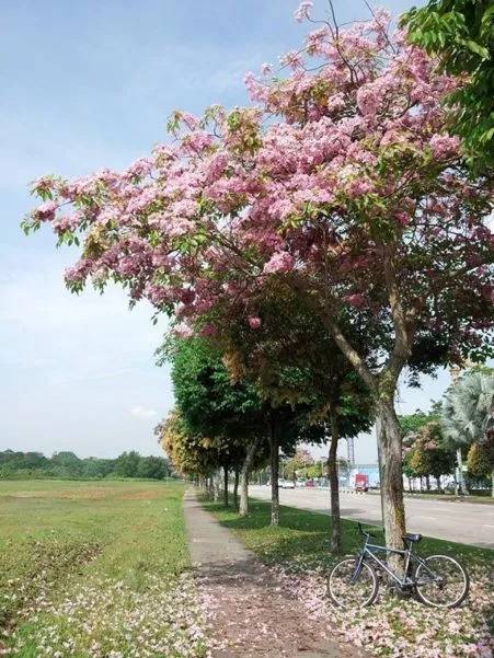 紫花风铃其实颜色有很多,分白色、粉色、黄色和紫红等,新加坡比较常见的是粉色和白色的。