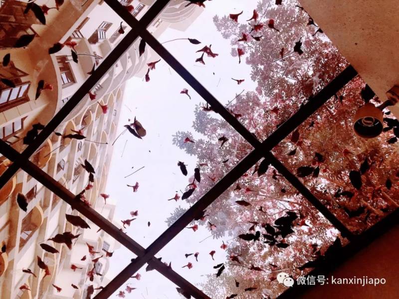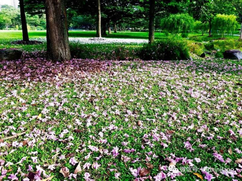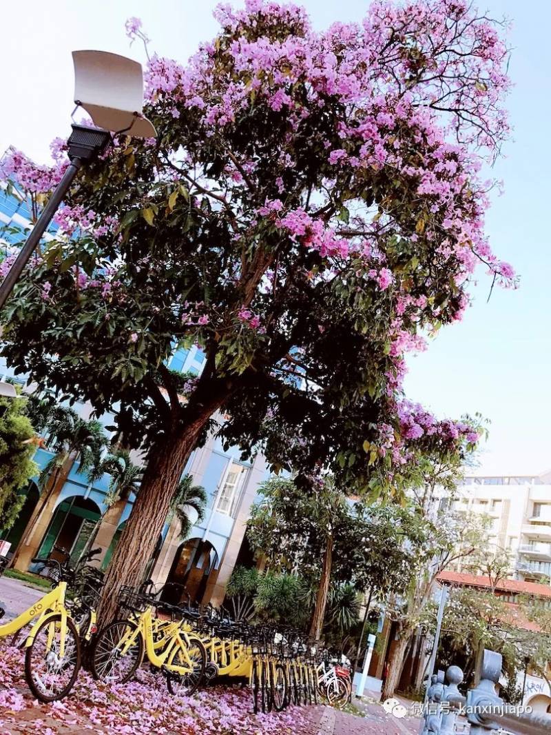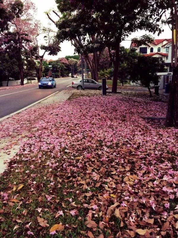 为什么新加坡这么多紫花风铃?因为这种花喜高温,生育适温约23~32度。它一年有两次花季,大约在每年3-4月和8-9月左右,花期很短暂,盛开后不久便会凋谢。所以,我们便得以看见满地粉红~