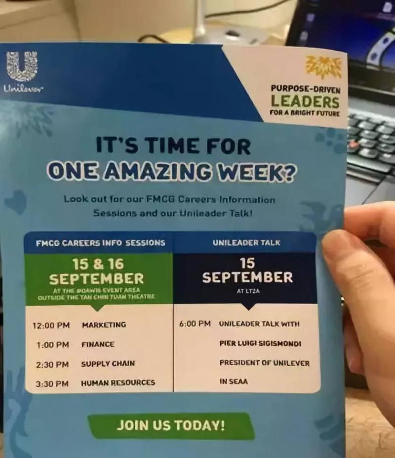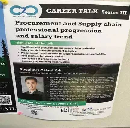 在南洋理工大学里经常有一些社会人士开讲座,一定要好好把握这样的机会!一方面可以增进自己对职业的了解,另一方面可以锻炼自己的英语。