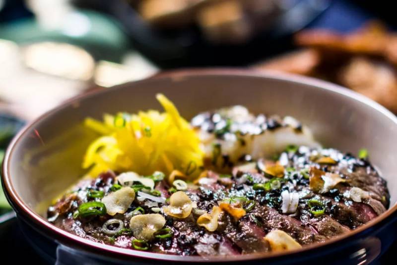上面有腌牛肉和一个生蛋黄