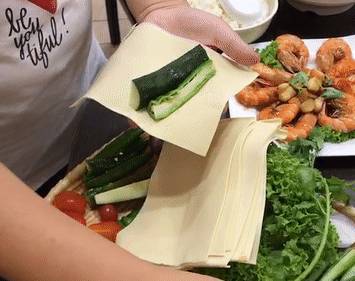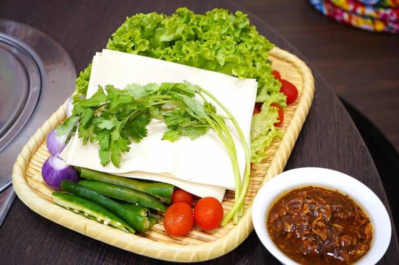 吃的时候用豆腐皮包着蔬菜蘸着鸡蛋酱就可以了。