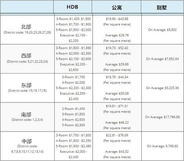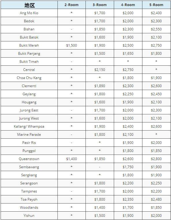 组屋在新加坡各地区的平均租金