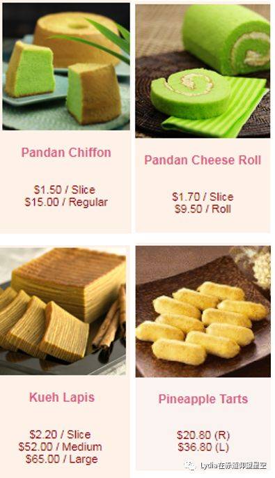 或者在机场Bengawan Solo蛋糕店买一盒绿蛋糕(Pandan Chiffon, Pandan Cheess Roll),黄梨塔(Pineapple Tarts),马来糕点千层糕(Kueh Lappis)带回家也是很好的手信。以下为Bengawan Solo官网显示的价格。