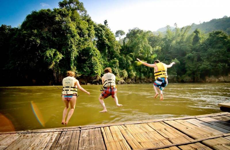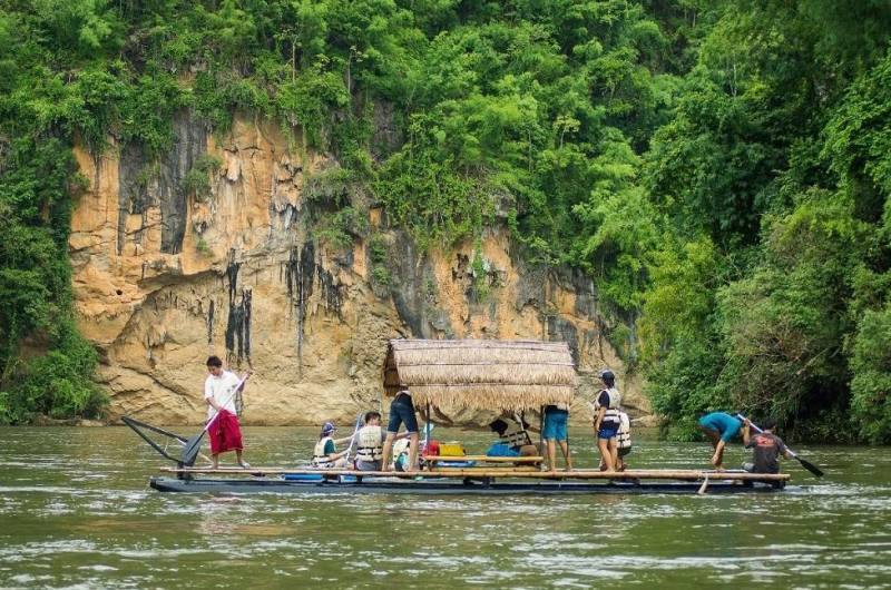 Day 3) 北碧府一日游:前往 Sai Yok 瀑布,瀑布非常壮观,是西约国家公园最受欢迎的景点。这里不单有国外慕名而来的游客, 也是泰国当地人钟爱的聚会地点。午餐后前往 Phutakien 码头,乘坐长尾船到达桂河丛林浮筏度假村,沿途你会看到壮丽的峡谷和自由飞翔的鸟群。酒店提供绝尘于都市外的自然宁静,被美丽的河水、山脉和丛林所环抱,在夜晚,酒店提供独特的油灯,凭添诸多乐趣及情调。所有客房均配备有蚊帐和基本的洗浴用品,您可搭乘临水的竹筏四处徜徉,附近有譬如老虎庙等,极具刺激和冒险。晚餐后还可以观赏 45 分钟的蒙人传统舞蹈,夜晚在甲板上看星星听流水,别有一番情趣。(早午晚餐)