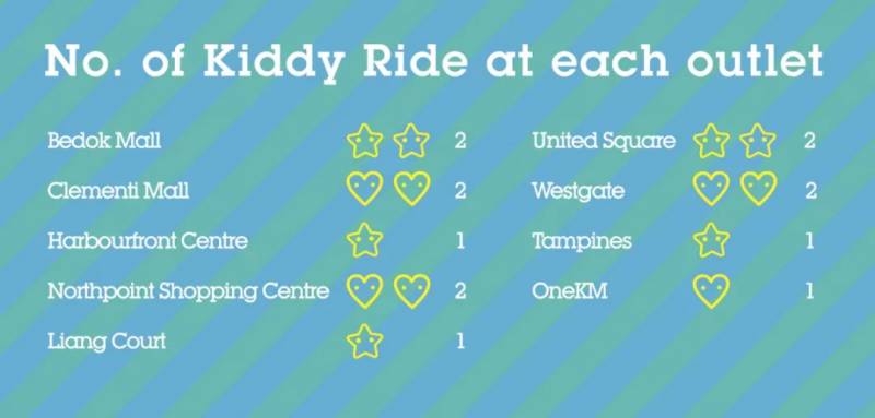Bedok Mall, Clementi Mall, Harbourfront Centre, Northpoint Shopping Centre, Liang Court, United Square, Westgate, Tampines and OneKM