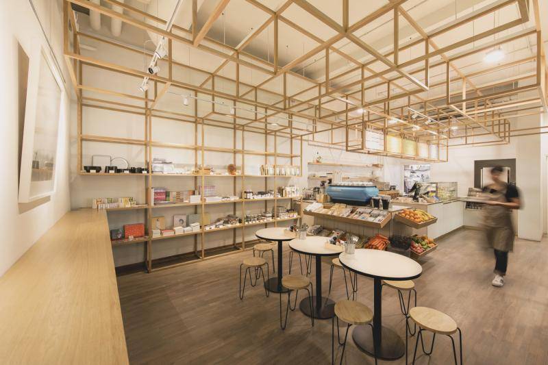 SPRMRKT有两层楼,贯穿整个空间的主题是餐饮、精品消费和艺术。一楼是随性咖啡座和零售区,售卖巧克力贵妃糖蛋糕、全天早餐、沙拉、汉堡等轻食,也供应手工咖啡和啤酒。一角的零售区则可看到来自本区域的手工品、书籍、酱料、零食、厨房用具等个性产品,都是一般零售店找不到的限量生产物品。据郭素姗介绍,这些产品都使用天然优质原料,其中就有Mmerci Encore的护肤精油,来自越南的One4One椰油美容产品,Salt & Sweeter精品文具等等。