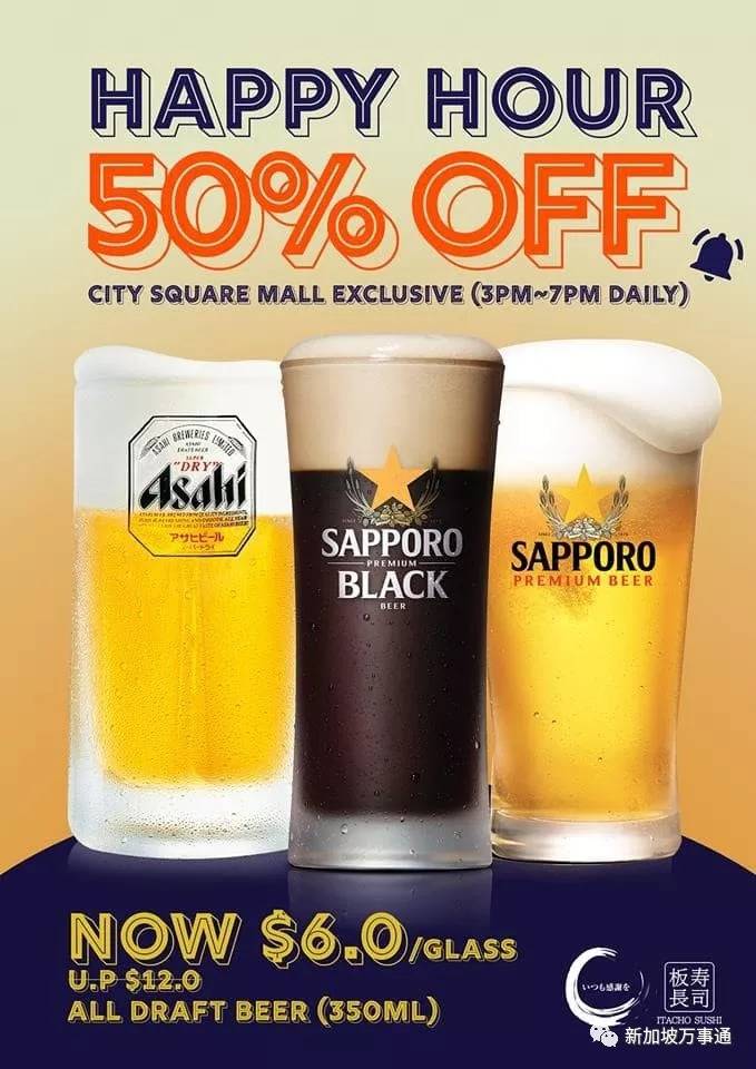 吃寿司喝啤酒什么最开心了,现在板长寿司啤酒半价活动!原价12新元的350ml的啤酒,现在特价只要6新元。