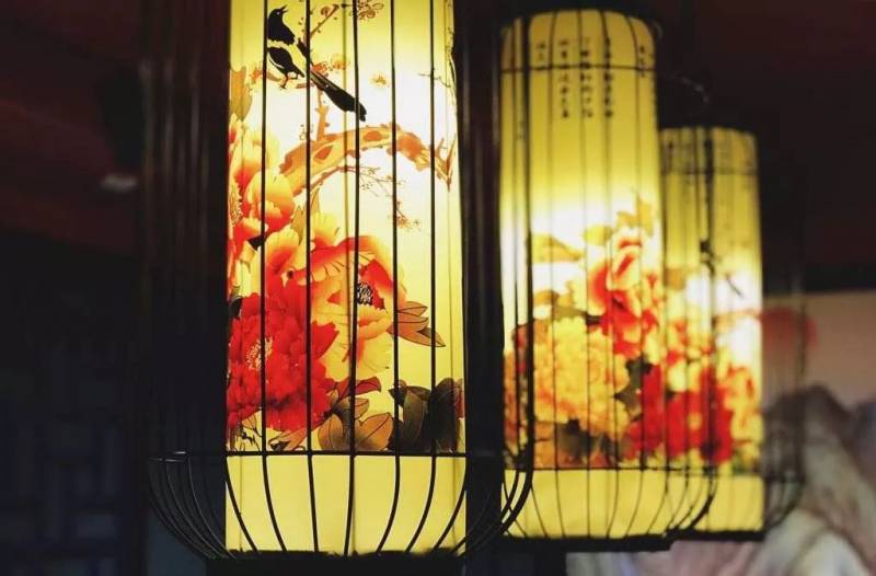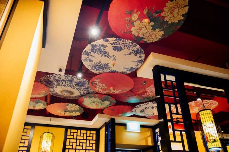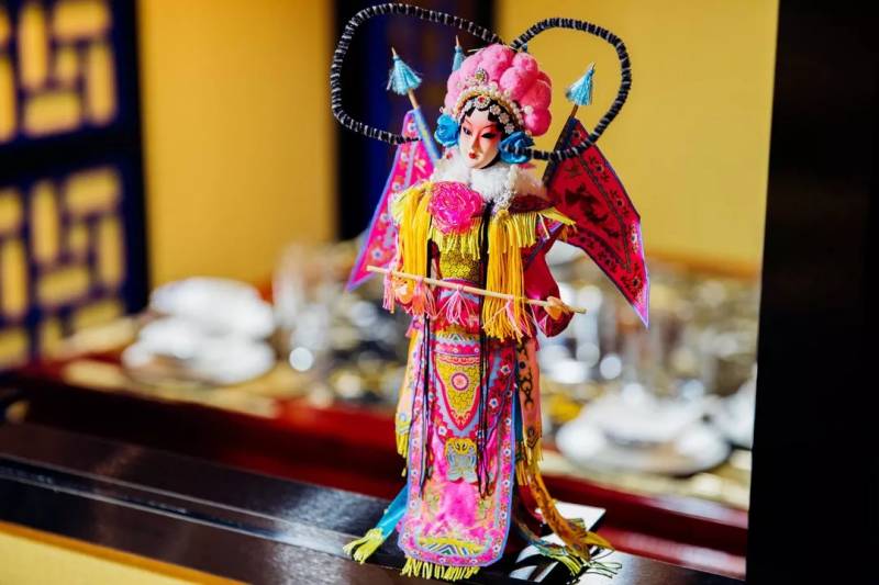 红灯笼、拱门隔断、青花纸伞、京戏人偶