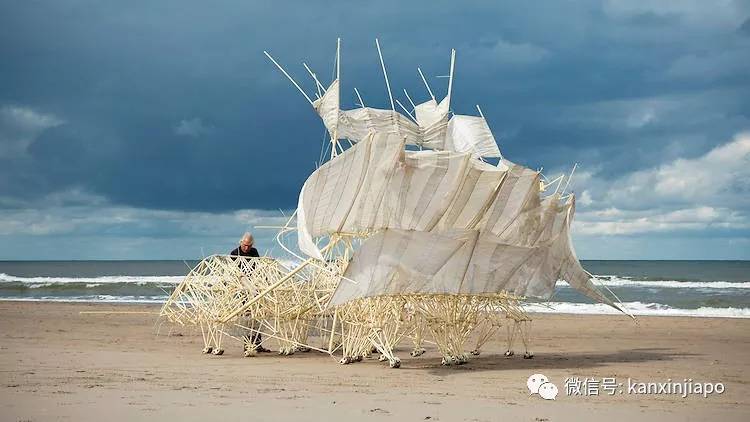 当艺术,科学,工程和表演相遇时,就会发生“地球上的新物种”,这是由Theo Jansen带来的海滩仿生兽,在展览现场共有13种形态各异的仿生兽,其中最大的有72只脚共200kg重。它们靠风力推动,通过支架风帆和塑料瓶这些仿生兽能够在风力下走动起来。