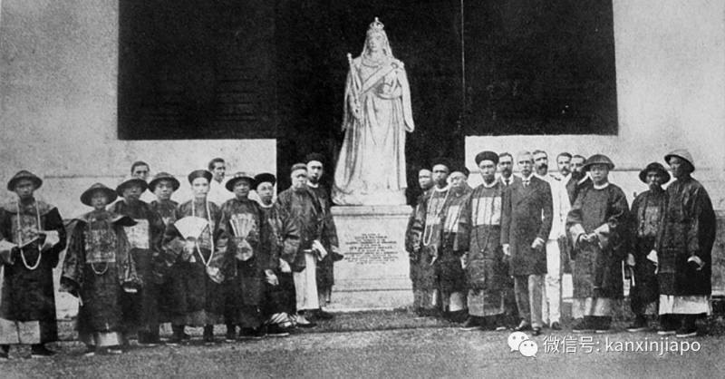 ( 1887年,为庆祝英女王维多利亚登基50周年,新加坡华社领袖立了个女王雕像,他们大部分穿的是清朝官服。)