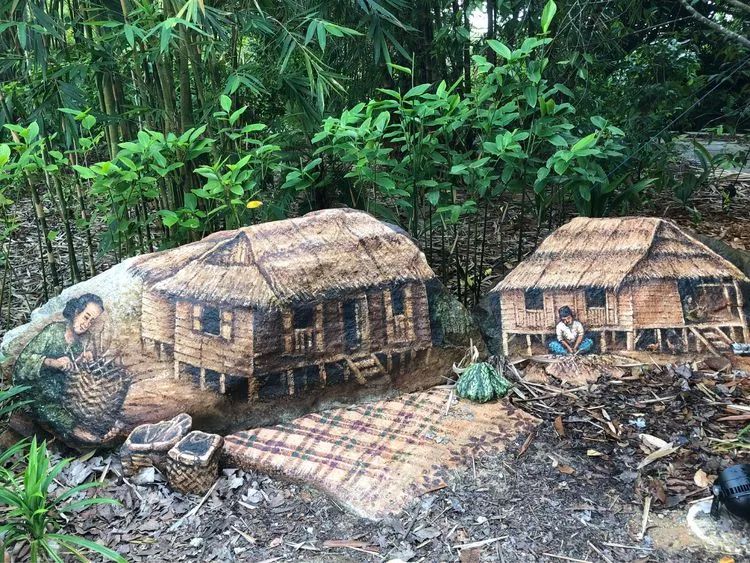 Craft Mural这幅石头壁画描绘了植物如何用于建造房屋以编织篮子。