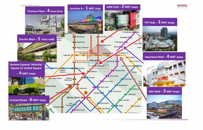 1站地铁到碧山地铁的Junction 8商场,2站地铁到宏茂桥的Ang mo Kio Hub商场,3站地铁到实龙岗的东北部最大的商场NEX Mall,约4分钟车程到Thomson Plaza,6站地铁到达乌节路Ion Orchard商场,还有汤申一带的联排店屋区,有特色的餐馆。