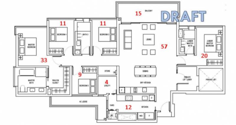 5房户型,面积为195平方米/2099英尺,有钱人喜欢买的户型,客厅多达57平方米,大到可以带小孩踢室内足球或者室内赛车,任性的主卧和卫生间面积多达33平方米,自带衣帽间,女主人最爱的独立衣帽间,大平层大户型设计,没有浪费的面积。