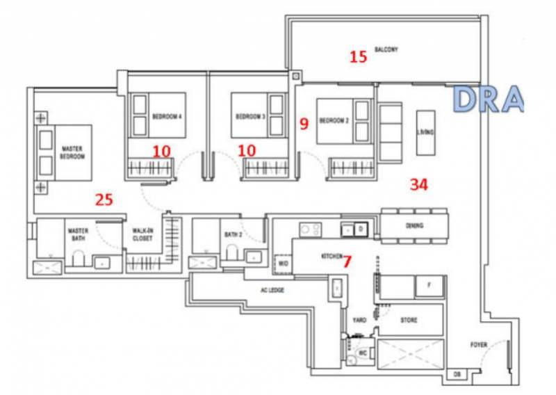 4房户型,面积为132平方米/1421英尺,配置大阳台,亮点是主卧自带衣帽间,女主人最爱的独立衣帽间,面积多达25平方米。