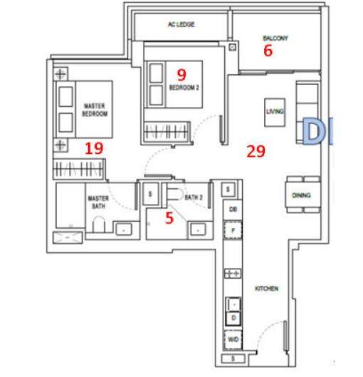 两房户型,面积为71平方米/764英尺,连普通房都有9平方米,主卧加卫生间更是有19平方米,完全可以媲美三房的主卧面积