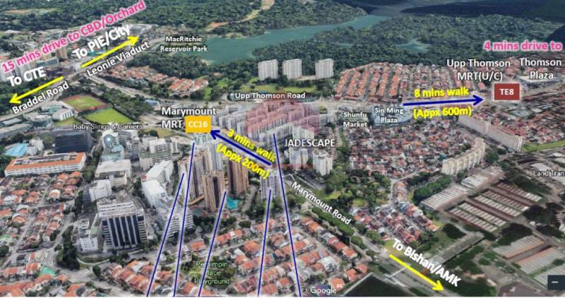 公寓周围有多达四条地铁线,连接黄线的玛丽蒙地铁站/Marymount MRT,正在兴建的汤申地铁线,预计2019年完工,项目离Upper Thomson 地铁站只有600米,8分钟步行就可到达,碧山地铁的红色地铁线,还有政府计划将来兴建的跨岛地铁线,预计2030年完工。
