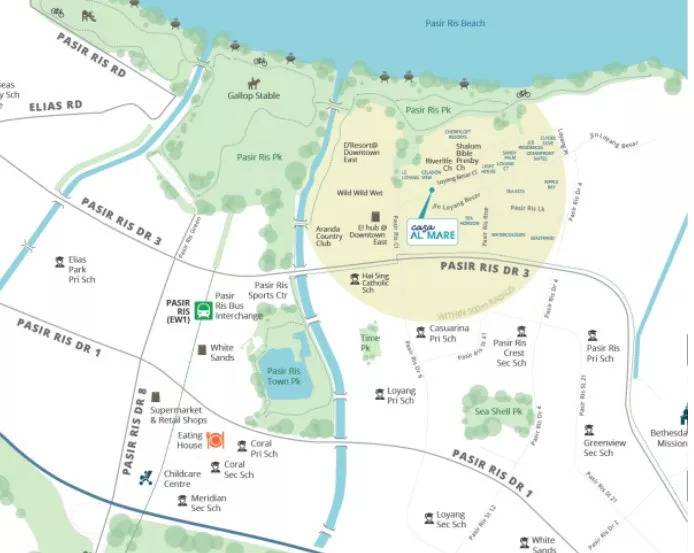 Casa Al Mare距离东西线东部的终点站巴西立地铁站(Pasir Ris MRT)约1.0公里,步行需15分钟,但附近就有巴士,2站即可到达。