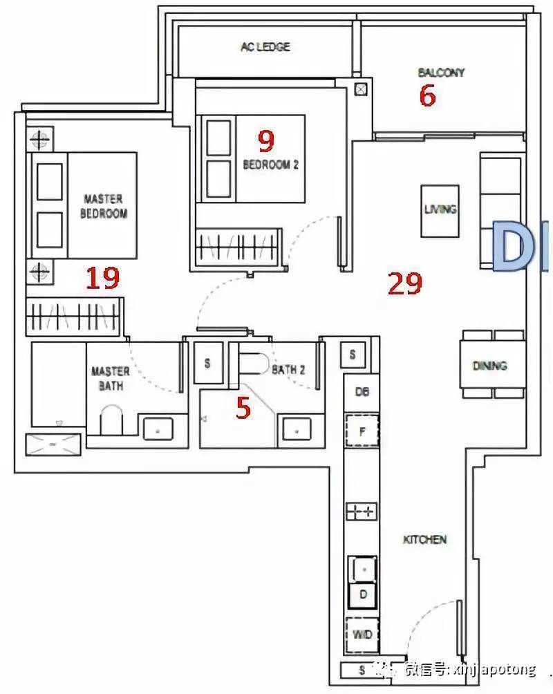 两房户型,面积为71平方米/764英尺,连普通房都有9平方米,主卧加卫生间更是有19平方米,完全可以媲美三房的主卧面积