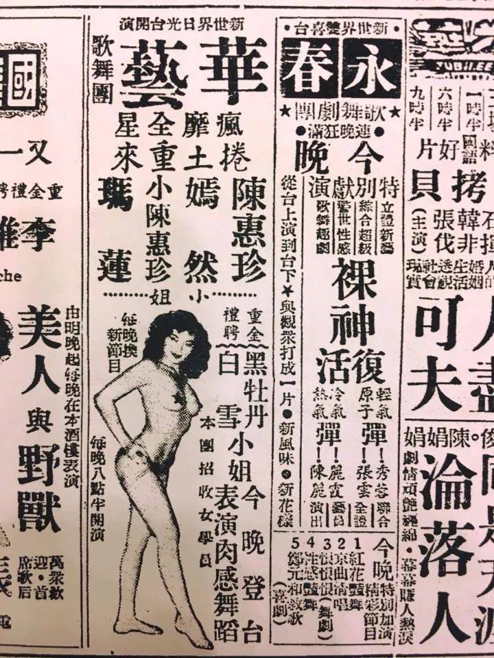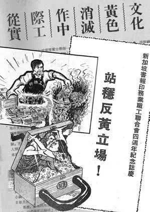 詹道玉《战后初期的新加坡华文戏剧》一书提到,黄色小报大为畅销,以艺术为幌子的歌台,卖弄低级趣味,最后沦为大腿舞、脱衣舞,还有外来的“艳团”,色情小说、黄色连环图充斥市面,色情、打斗的美、日、港影片推波助澜,整个社会成了黄色大染缸。