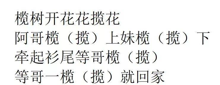 那个年代参加山歌会的客家人多数是普通劳苦大众或初来乍到的过番客,文化修养一般不高,往往借唱歌占女人的便宜。大家一起对唱情歌,嬉戏调侃的热情也不断升温,而情歌内容的尺度也越来越大,甚至有伤风化。例如: