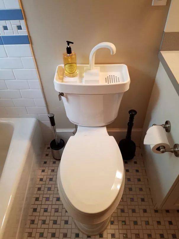 再比如,洗手池的设计:洗过手的水,可以直接用来冲厕所。