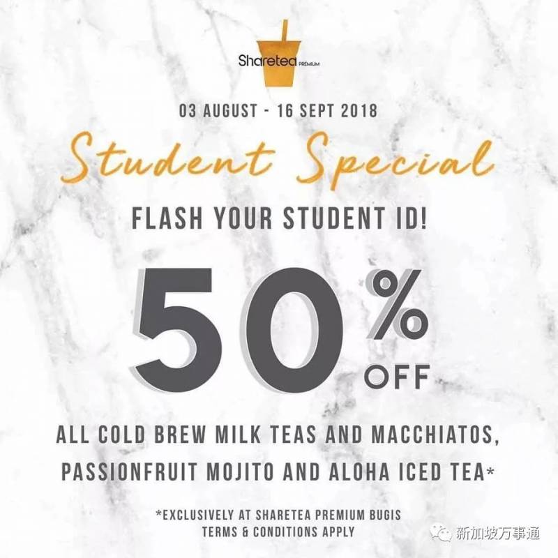 Sharetea现在有超给力的折扣优惠,学生们可以享受所有冷冲泡奶茶的半价优惠。
