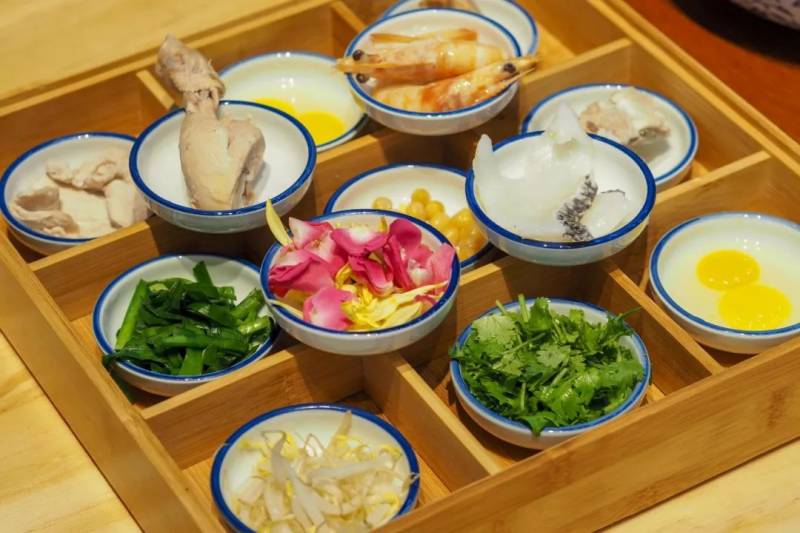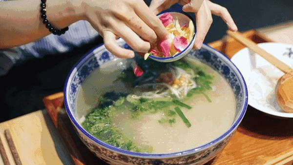 把食材加到汤里可不是乱加一通,要有一定的顺序:第一步是先加生的鹌鹑蛋,然后加肉类海鲜等食材,再加豆芽、豌豆、韭菜等蔬菜类食材,最后放入米线,再撒上玫瑰和菊花花瓣。