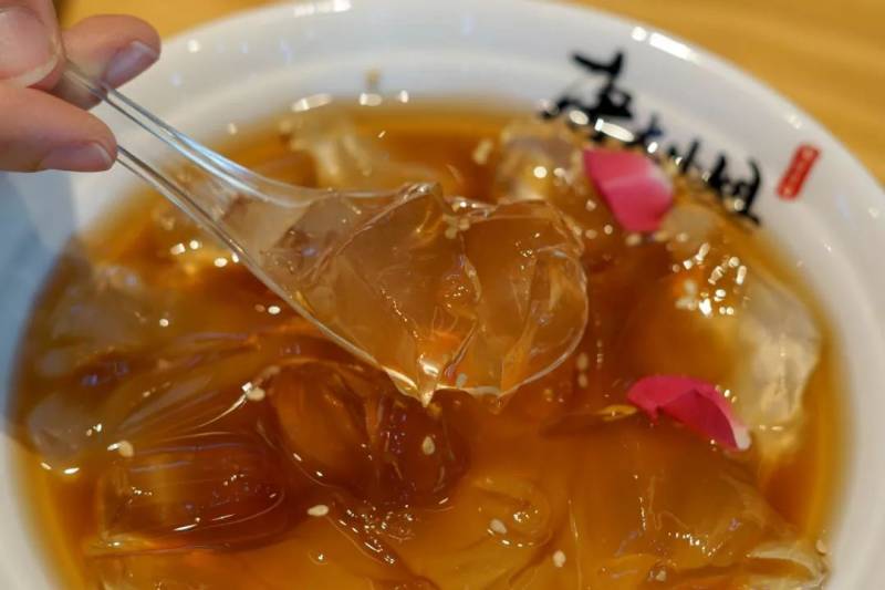 这里的冰粉不添加任何的石灰水,都是直接用手工搓出来的冰粉汁液直接冷藏凝固。