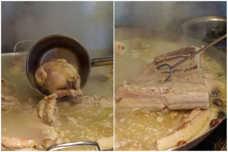 将在汤中熬煮几小时的五花肉放到油中低温油炸一个多小时,将带皮的部分炸至金黄色,又保持肉的嫩度。
