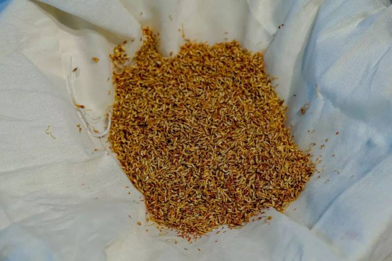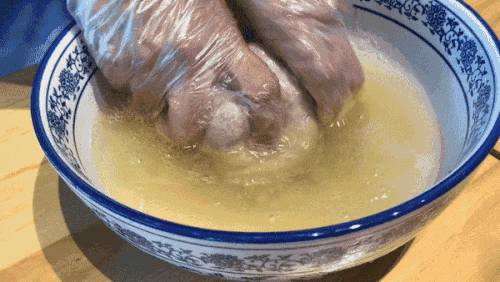 将冰粉籽包在纱布中绑紧,在清水中不停的搓揉数分钟,直到里面的汁液都到水中。