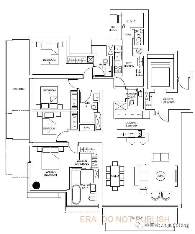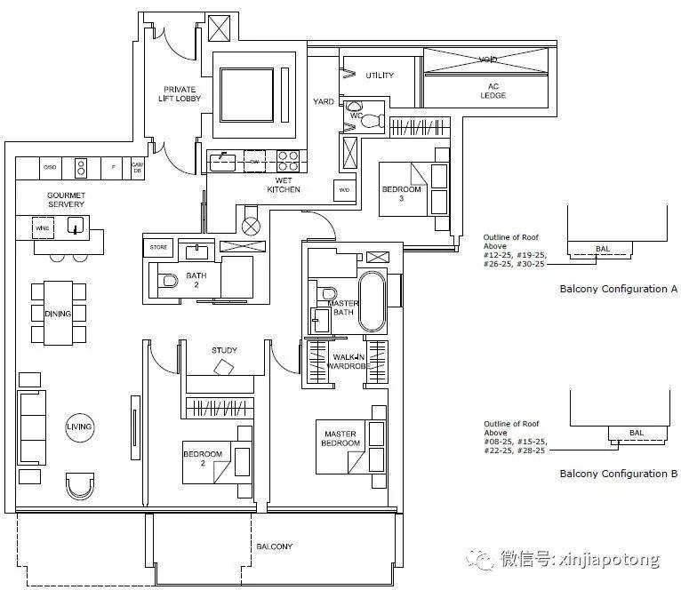 4房户型,面积从190平方米/2045平方英尺, 自带私人电梯,私密性好和显档次, 带大阳台,单位朝南,高楼单位可以看海景哦,价格为新币564.3万新币起