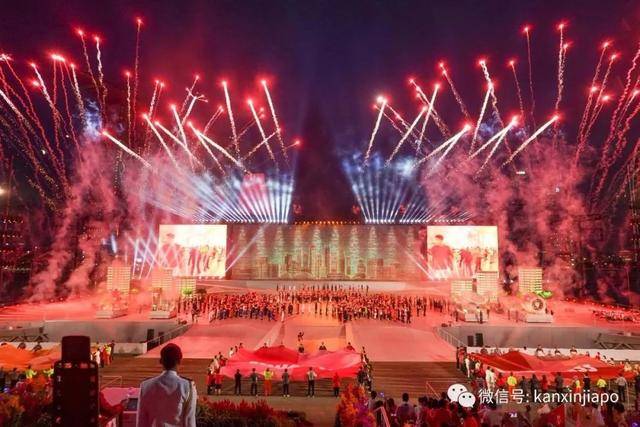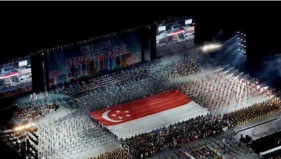 今年还特别有个观众挑战环节,2万5000名观众同时举起牌子,摆出了我爱新加坡字样。
