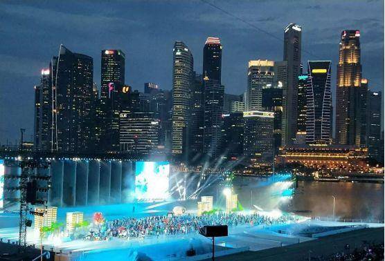 7点20分,表演从海上音乐喷泉开始。文艺表演和舞台背后的新加坡夜景相映成趣~ 浮动舞台上载歌载舞,现场每个观众,都有一个泡泡灯,随着音乐摇晃着,格外壮观!