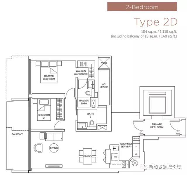 1)二卧室,使用面积104或105平方米/1119或1130平方尺,售价从$2,834,340起($2,533新元/平方尺)。