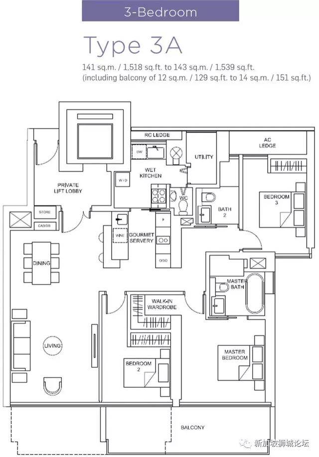 3)三卧室,使用面积140-143平方米/1507-1539平方尺,售价从$3,971,100起($2,580新元/平方尺)。
