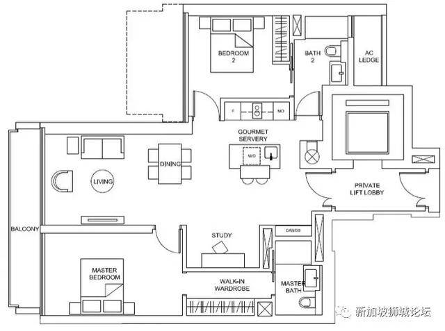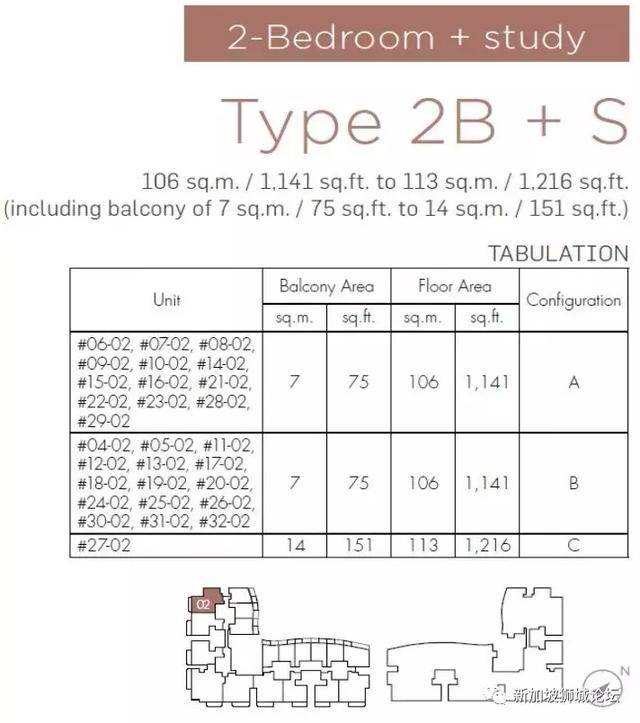 2)二卧室+书房,使用面积106平方米/1141平方尺,总售价从$3,018,640起($2,646新元/平方尺)。