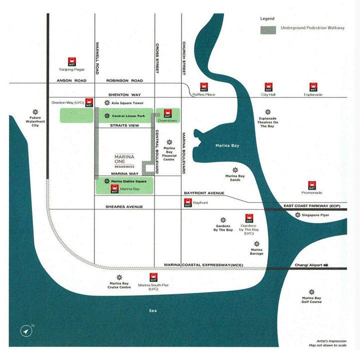 滨海盛景豪苑的楼下就是三个地铁站,包括海湾地铁站(Marina Bay Station)和市中心地铁站(Downtown Station) ,以及一个正在修建中的珊顿道地铁站(Shenton WayStation),南北线、环线、滨海市区线和未来的汤申线就在眼前。