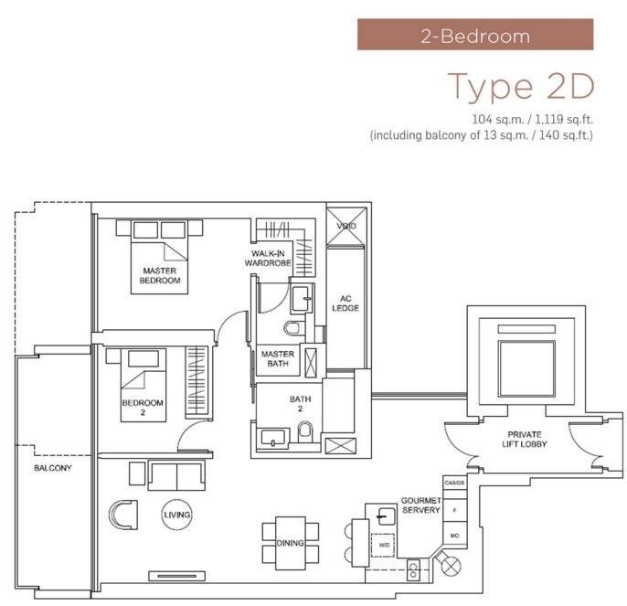 二卧室,使用面积104或105平方米/1119或1130平方尺,售价从$2,834,340起($2,533新元/平方尺)。