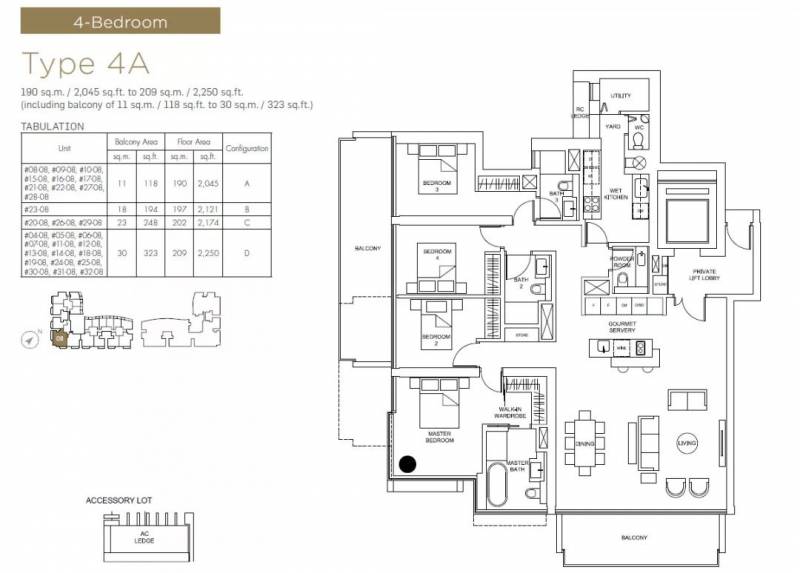 四卧室,使用面积190-209平方米/2045-2250平方尺,售价从$5,325,000起($2,604新元/平方尺)。