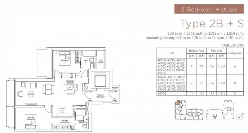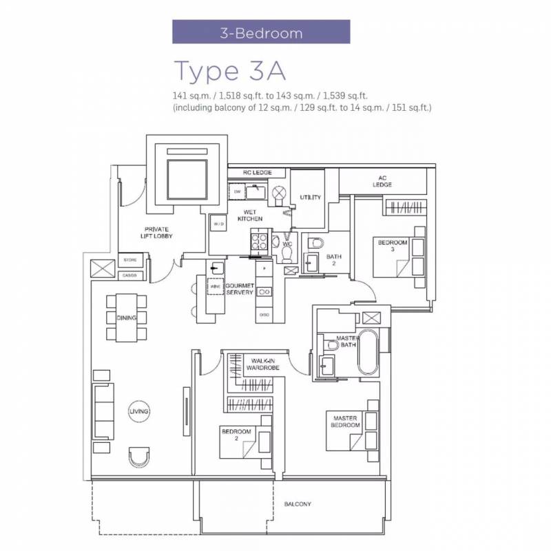 三卧室,使用面积140-143平方米/1507-1539平方尺,售价从$3,971,100起($2,580新元/平方尺)。