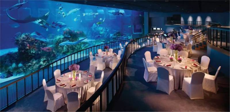 用餐时有各种珍稀鱼类在你身边游来游去,仿佛置身于海底享用美食,这是很奇特的用餐体验。