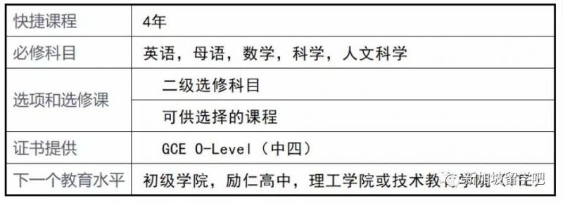 中学快捷班学制四年,毕业后参加新加坡-剑桥普通教育(普通水准)证书会考,就是通常说的O-Level考试。根据成绩或个人意愿申请初级学院或理工学院(国际奖学金生如SM1奖学金只支持就读初级学院,转读理工学院要放弃或取消奖学金)。