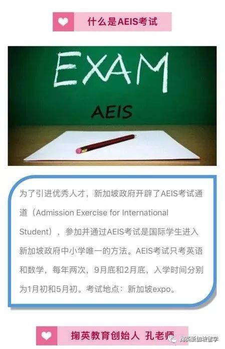 1. 英文孔老师:原是北京新东方扬州外国语学校资深英语教师。到新加坡后一直致力于AEIS培训。凭借对中国学生的了解,及多年AEIS的成功辅导经验,孔老师送了一批又一批的学生进入新加坡政府中小学,圆了许许多多孩子的新加坡留学梦,给了他们高飞的翅膀,让他们有了不一样的人生!