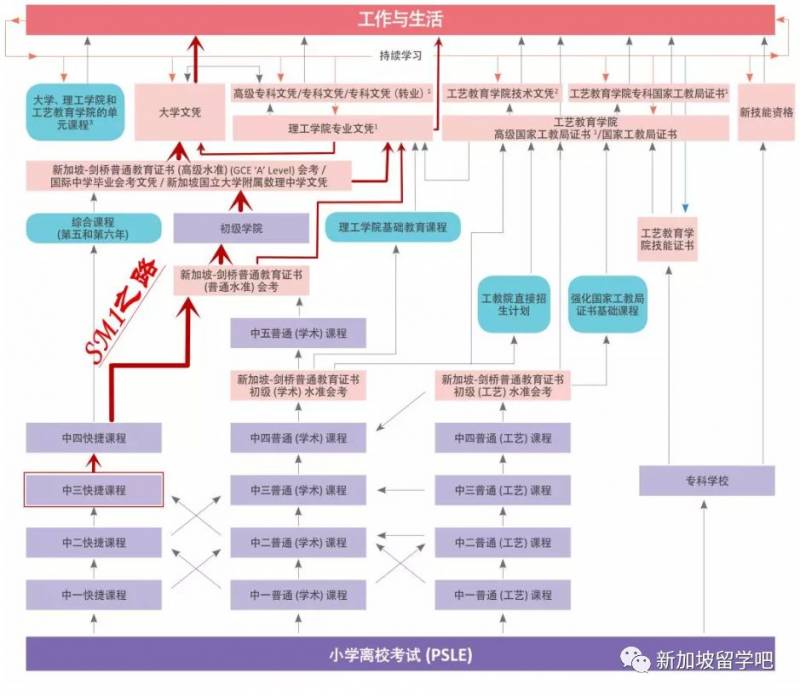 新加坡中学教育示意图如下,新加坡中学分中学快捷班、中学普通(学术)班及中学普通(工艺)班,本文中学部分以快捷班为例子介绍。